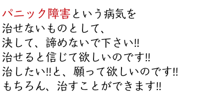 少しだけ頑張れば、パニック障害という心の病を乗り越え、規制のない以前の人生を取り戻せるのです。