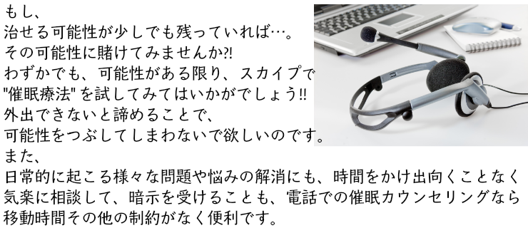 交通費・宿泊費と、多額な費用がかかるの地域にお住まいの方々は、直接の催眠面接と電話・ネットでの